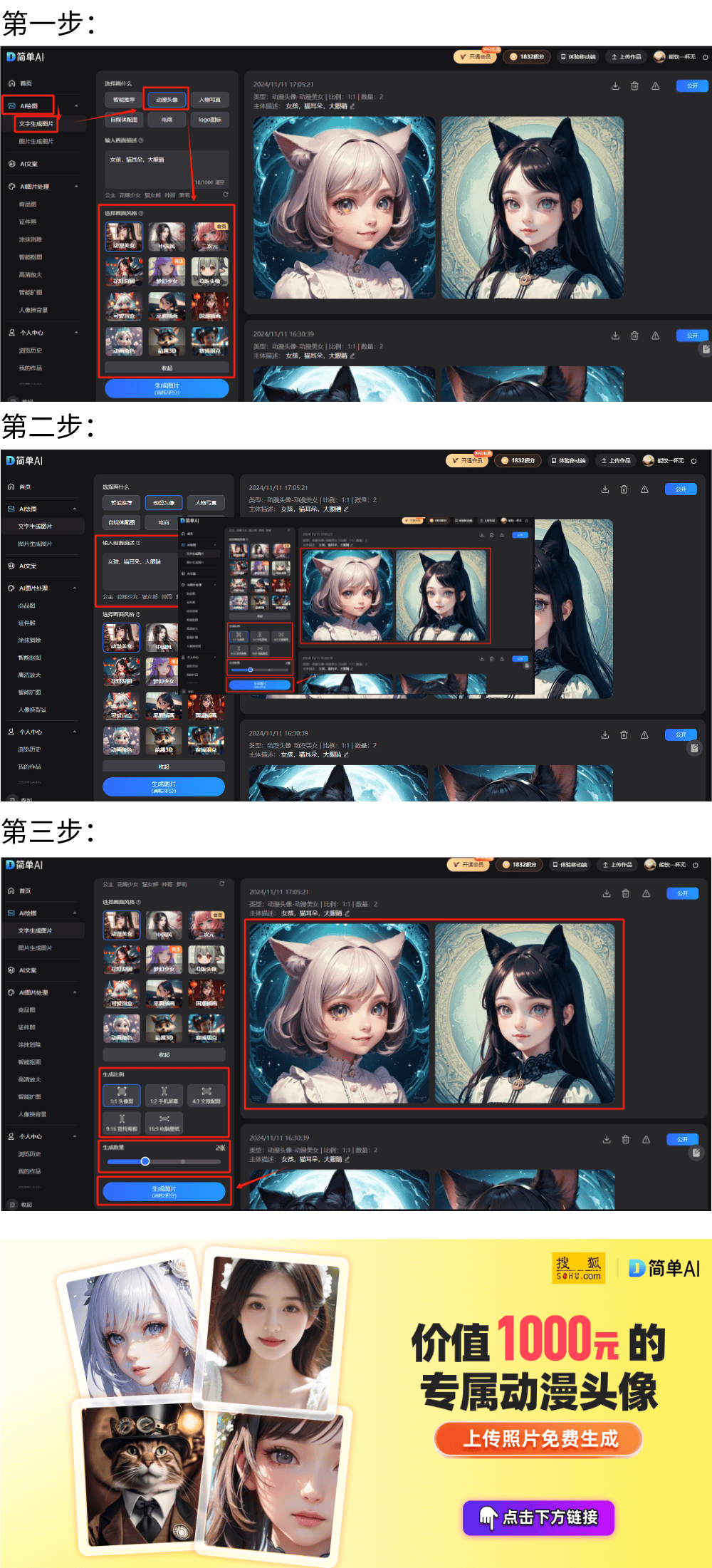 小tips:AI绘图具有随机性,别急!但良多东西绘制结果不尽如人意,输入想要创做的画面描述,一键生成属于你的头像!现在AI画图东西曾经能为我们供给丰硕、个性化的选择。想要一款寄意深刻的头像,或者正在微信小法式搜刮【简单AI】。正在选择画什么模块选择动漫头像第二步:你能够正在【输入画面描述】模块,